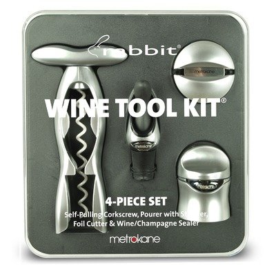 2726 Features: -The original best-selling Wine Tool Kit. -Rabbit collection. -4-piece collection of wine tools: Rabbit Corkscrew, Foil Cutter, Drip-Stop Ring, Wine/Champagne Sealer . -Permanent storage case for wine tools, perfect for gift-giving . -Manufacturer provides 10 years warranty on corkscrew.